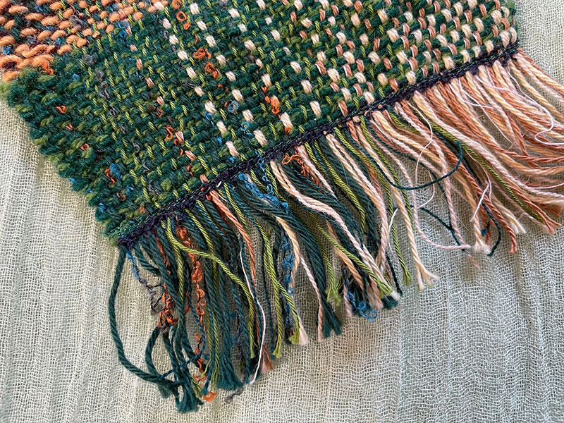 縦糸を結ばない場合、織り始めと終わりの所にミシンをかけるとほどけにくくなるそうです。