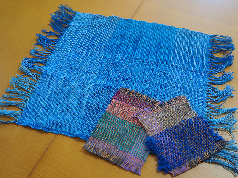 1時間でランチョンマットまたはコースター5枚程度、2時間でマフラーくらいの大きさの作品が織れます。
